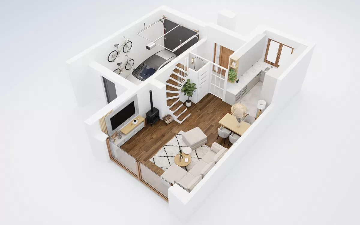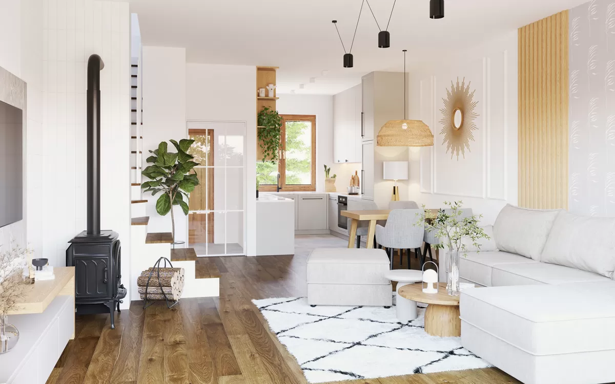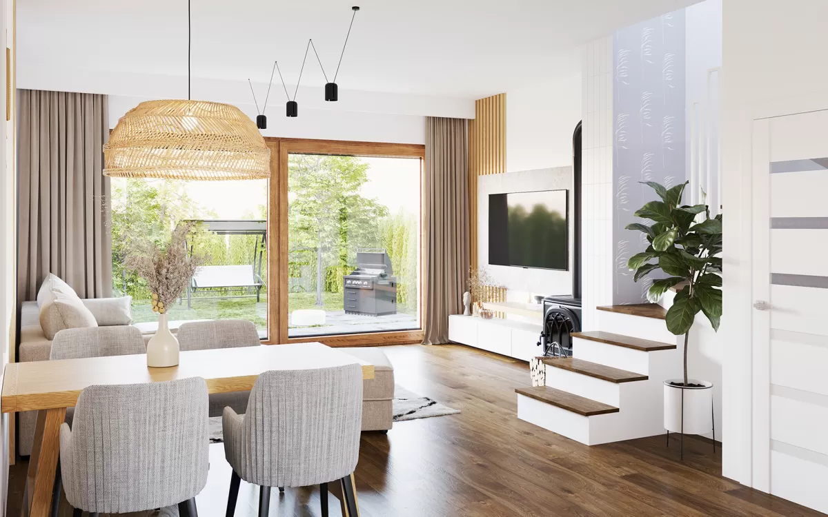 5. Stylowe elewacje z tynku zdobione płytą kwarcytową lub deską kompozytową