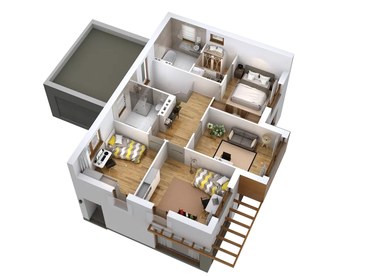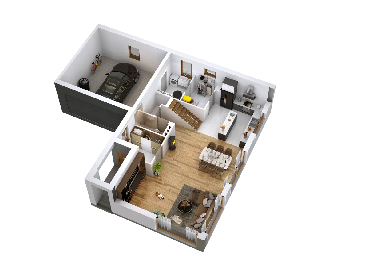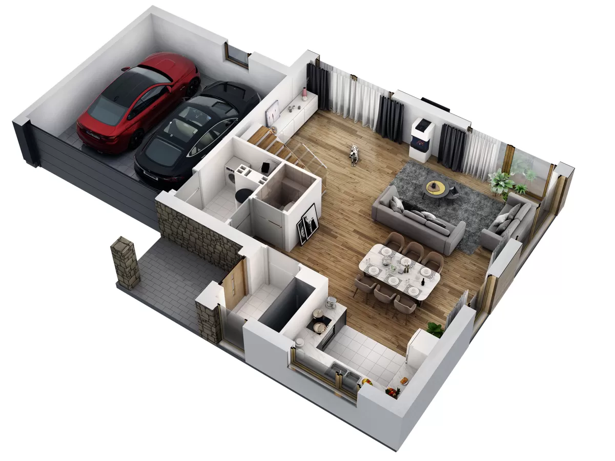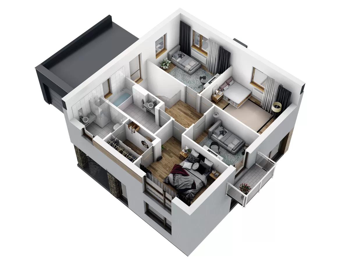 5. Stylowe elewacje z tynku zdobione płytą kwarcytową lub deską kompozytową